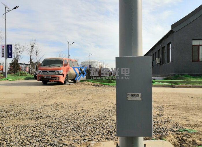 北京首都機場油庫區照明工程,場區共配置5套30米升降高桿燈和116套8米市電互補太陽能路燈